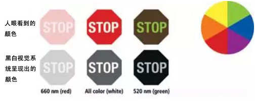 通過黑白單色相機(jī)也可以識(shí)別圖像中的顏色,這種方法需要選擇合適的燈光照明圖像。圖中上面一行圖片是人眼觀察到的圖像效果,而下面一行的圖像則顯示了單色相機(jī)呈現(xiàn)出的圖像效果。